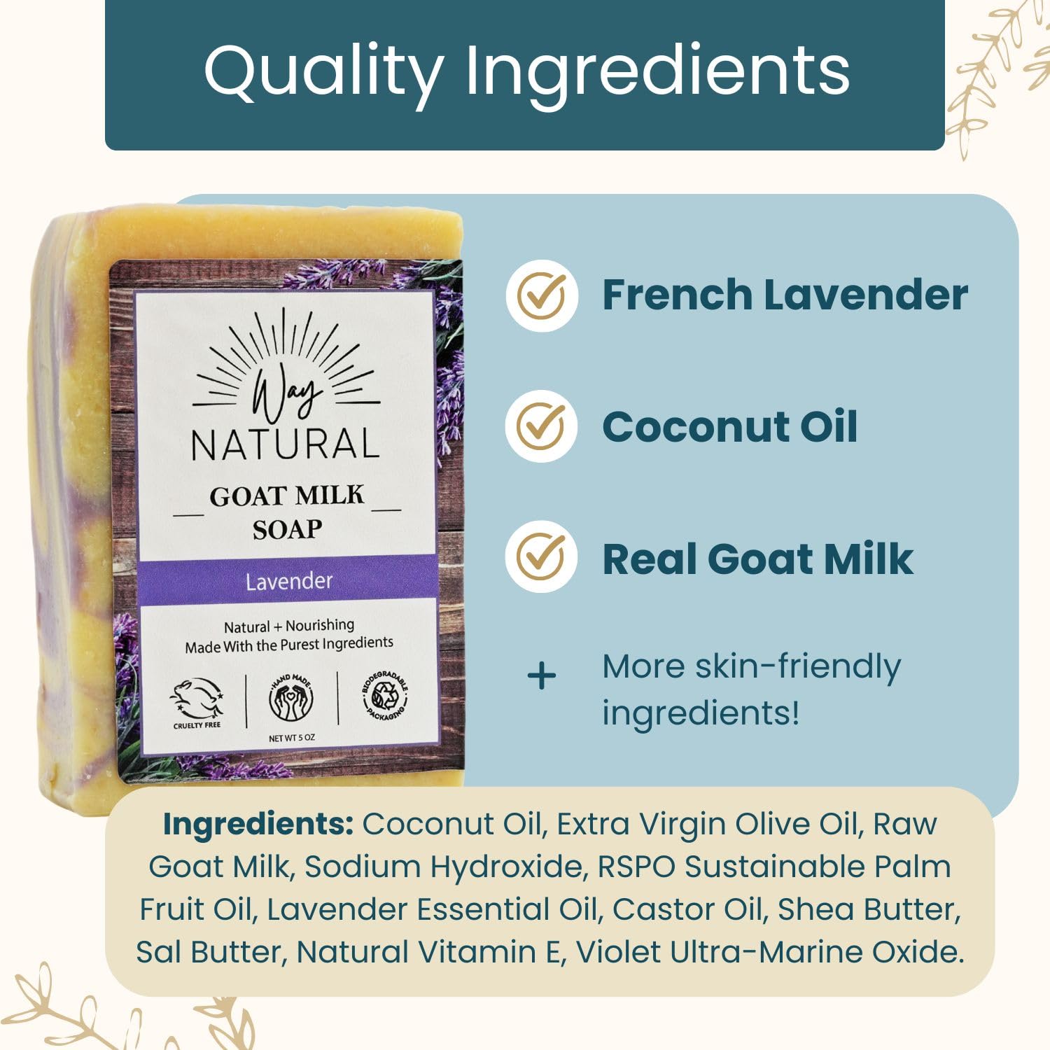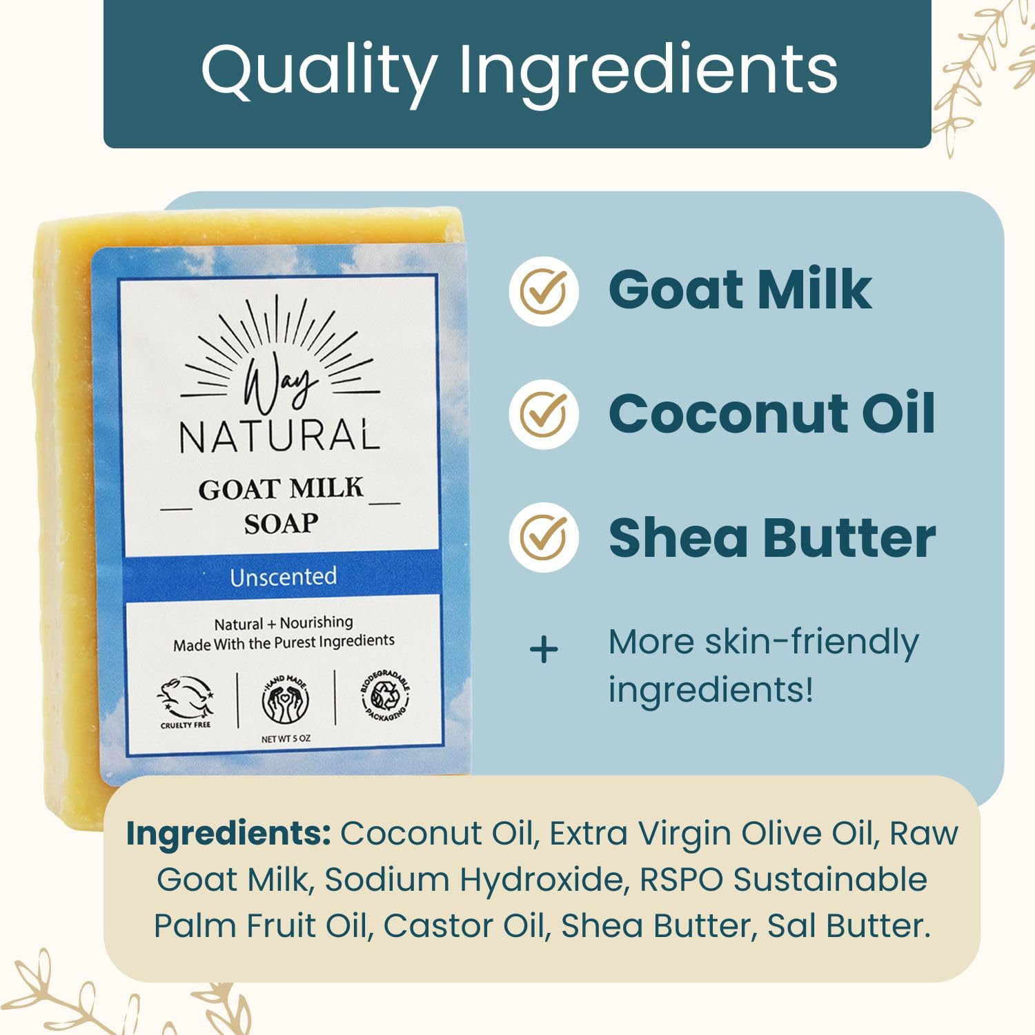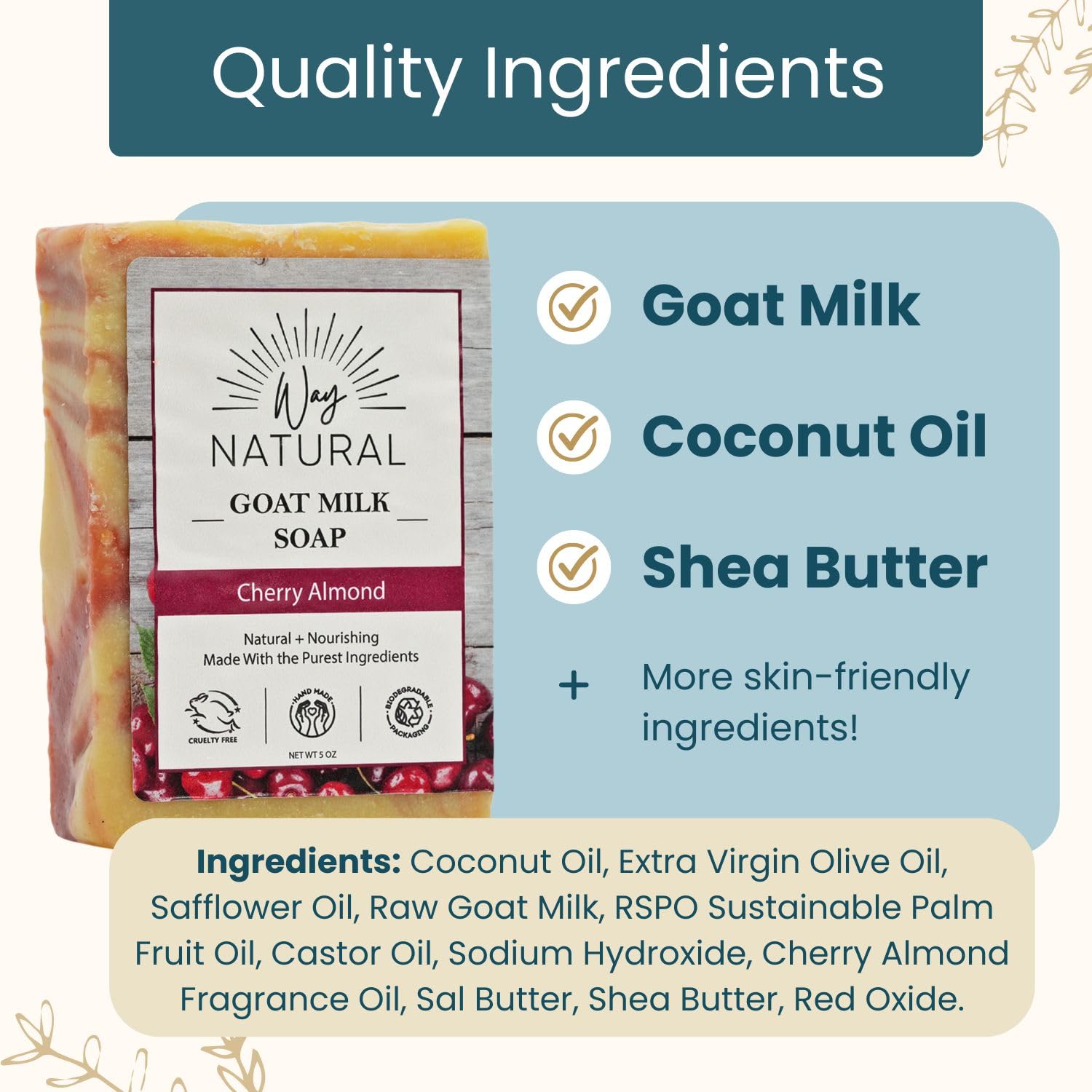 Premium Goat Milk: Each goats milk soap bar is made with REAL milk (NOT powder/caprae lac), sourced from free-range Nigerian dwarf goats. Cruelty-free and never tested on animals.