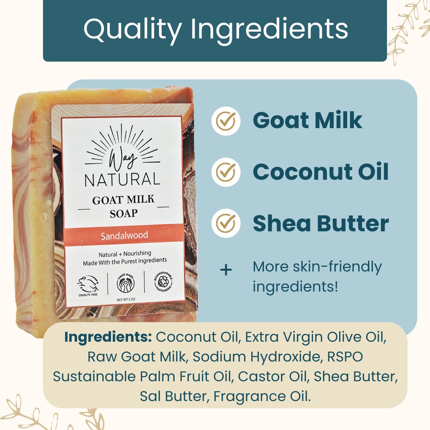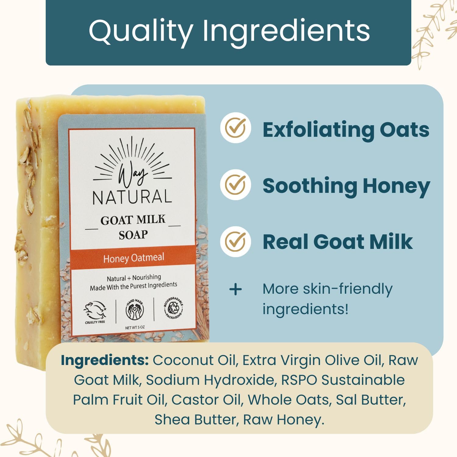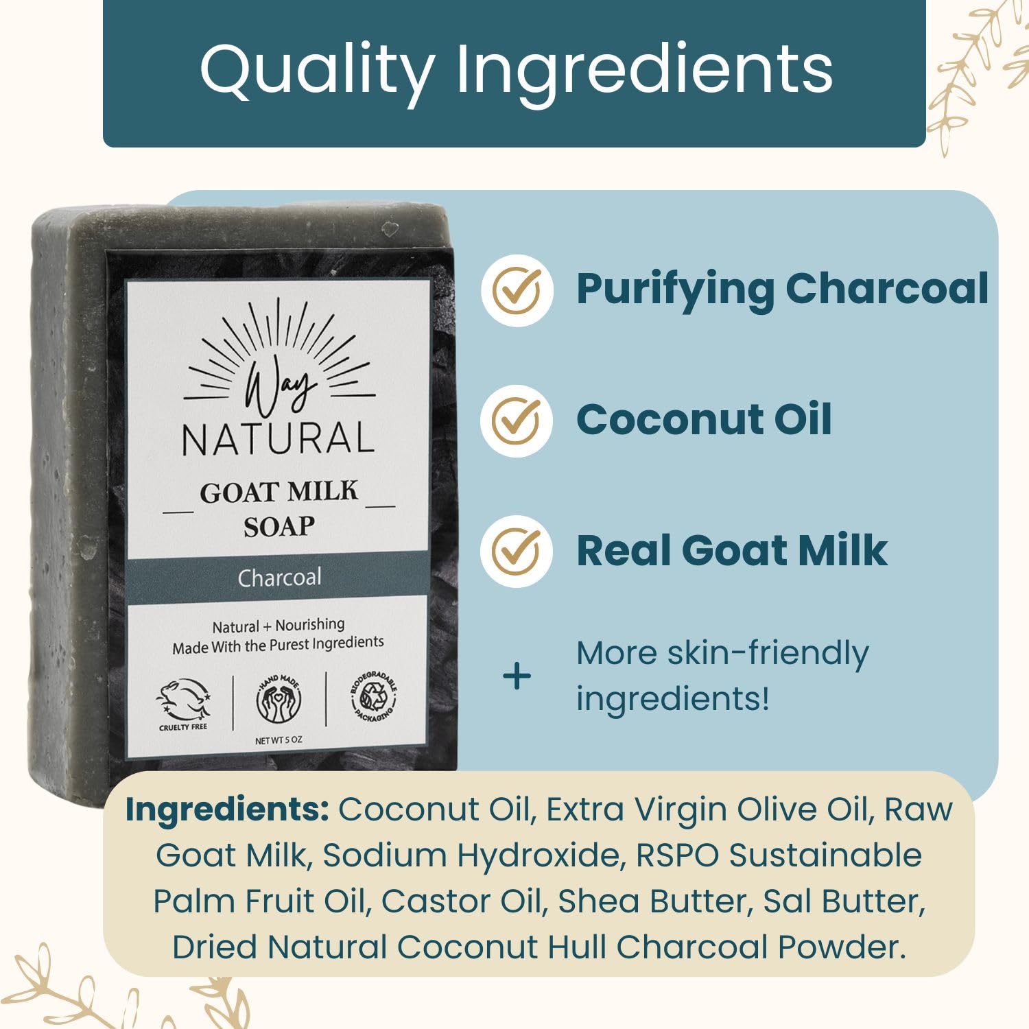 Premium Goat Milk: Each goats milk soap bar is made with REAL milk (NOT powder/caprae lac), sourced from free-range Nigerian dwarf goats. Cruelty-free and never tested on animals.